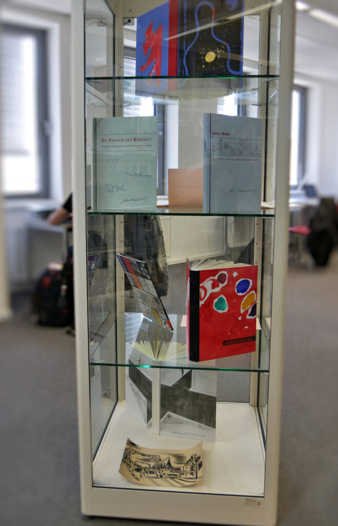 Vom 1. bis 26. April konnten Besucher eine Vitrinen-Ausstellung „Künstlerbücher aus dem Bestand der SLB“ besichtigen, die u.a. Exponate der Bücherkinder Brandenburg, von Marc Berger, Herzattacke oder Matthias Gubig enthielt.